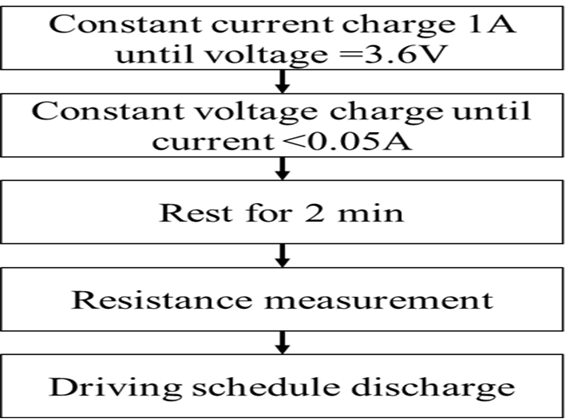 alternating between 0.5C, 1C, and 0C each for 30 seconds until the voltage dropped to 3.2V. The profile was repeated over the batteries cycle life