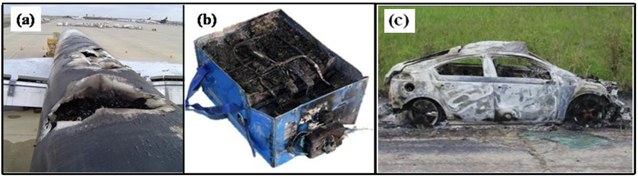 Although lithium-ion batteries are reliable and popular as energy storage devices, the thermal and electrochemical instability of the electrodes and the flammability of the electrolyte make lithium-ion batteries prone to catastrophic failures. Failures involving fires and explosions have resulted in numerous accidents in the consumer electronics, automotive and airplane industry involving millions of batteries. Fig. 3 shows a damaged United Parcel Service (UPS) cargo plan fire in 2006, a failed battery pack in a Boeing 787 in 2013 and a Chevy Volt battery fire after side-impact collision test in 2012.