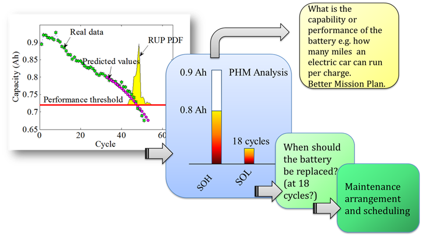 CALCE proposed an advanced BMS with prognostic components. The novel features in the new BMS include SOC prediction, SOH prediction, PHM-based decision making: Fig. 4 illustrates a decision making example based on PHM, the SOH of the battery can be evaluated. We not only can know the SOH at the current cycle, but also can predict the SOH in a future cycle. This allows for better mission plan and maintenance arrangement. Since we know the maximum capacity of the battery, we can predict whether the battery will run out of power during the mission. Second, PHM provides state-of-life prediction, or the remaining useful cycles of the battery. In this example, the remaining useful cycle is 18 cycles. Based on this information, the maintenance arrangement and action can be scheduled in advance to ensure the availability of the system and save cost.
