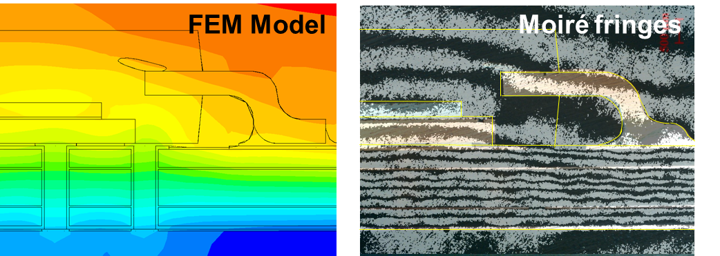 Prof. Bongtae Han and his Ph.D. student, Dae-Suk Kim, together with engineers at Robert Bosch GmbH, have successfully implemented a high displacement measurement technique under extreme temperature conditions for model calibration. The figure shows the y-direction displacement field obtained from the FEM (left) and fringe pattern obtained at -30°C by moiré interferometry (right). With the high sensitivity (contour interval of 417 nm) and high quality displacement field provided by moiré interferometry, correlation within one micron was achieved at the extreme temperatures. As a part of this collaboration, Dae-Suk Kim interned with the AE/EDT3 team at Robert Bosch GmbH in Germany for 2 months in 2013. The team will continue to work on prognostics and health management of electronic control modules through CALCE.